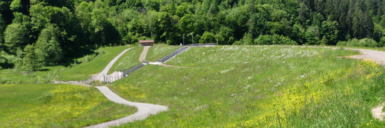 Foto: Neu angelegte Magerrasen am Hochwasserschutzdamm Bohrertal mit Gehölzpflanzungen am Bohrerbach im Hintergrund. | Ⓒ C. Seifert
