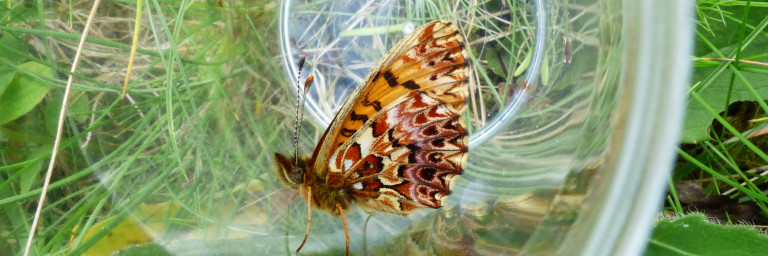 Foto: Natternwurzperlmutterfalter (Boloria titania) in einem Fangglas | Ⓒ B. Disch