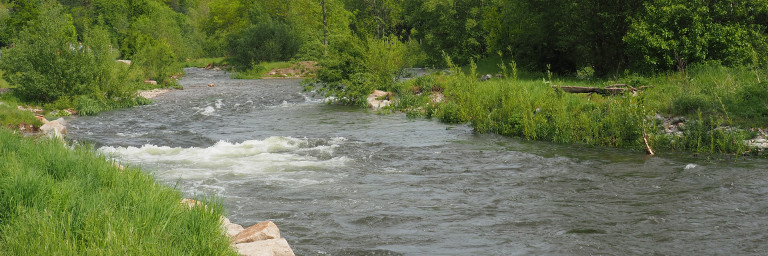 Foto: Renaturierter Bereich der Dreisam im Bereich der Kartauswiesen bei Niedrigwasser 2018. | Ⓒ C. Seifert