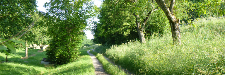 Foto: Blick auf einen Abschnitt des geplanten Radweges entlang der L87 mit artenreichen Böschungen und Baumbestand. | Ⓒ F. Kurz