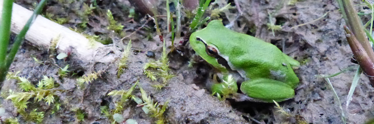 Foto: Der Laubfrosch (Hyla arborea) kommt im Projektgebiet an vielen Stellen vor. Im Bild ein Jungtier der Art. | Ⓒ B. Disch