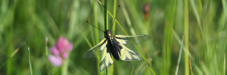 Foto: An der Teufelsburg bei Kiechlinsbergen gibt es eine große Population des Schmetterlingshafts (Libelloides coccaius); ein bundesweit seltener und gefährdeter Netzflügler | Ⓒ B. Disch